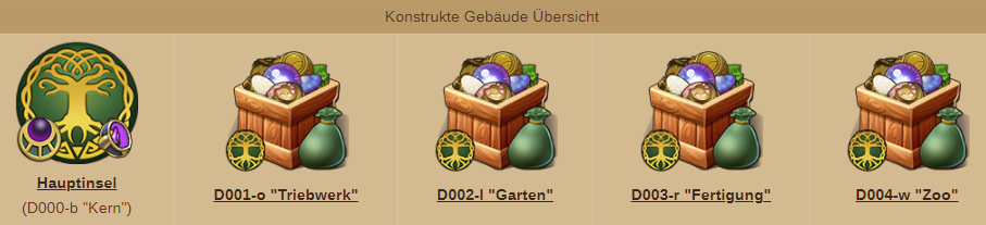 Wenn die Hauptinsel in deiner Stadt gelandet ist, kannst du mit dem Erstellen der ursprünglichen Ressourcen beginnen, die als Konstrukte bezeichnet werden. Hierbei handelt es sich um Konstrukte, die bei gemeinsamer Verwendung weitere Siedlungsgüter erzeugen. Konstrukte werden im Reiter der Hauptinsel produziert:
