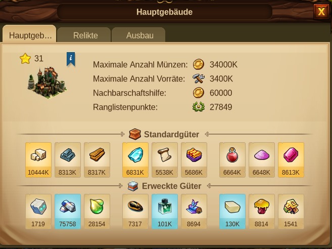 Das Hauptgebäude zeigt dir dein neues, gefördertes G6, sobald du die neuen Erweckten Güter erforschst hast. Wie bei deinen wertvollen Gütern, erhältst du einen Bonus, je nachdem, wie viele Relikte du für das jeweilige Gut auf Lager hast.