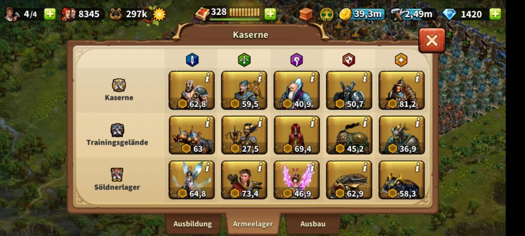 Die Übergangszeiten (also wo noch nicht alle Kaserneneinheiten auf 3 Sterne sind) wurden nicht berücksichtigt. Je nach Forschungsstand der eigenen Einheiten (1 bis 3 Sterne) kann es auch bessere Konstellationen geben.