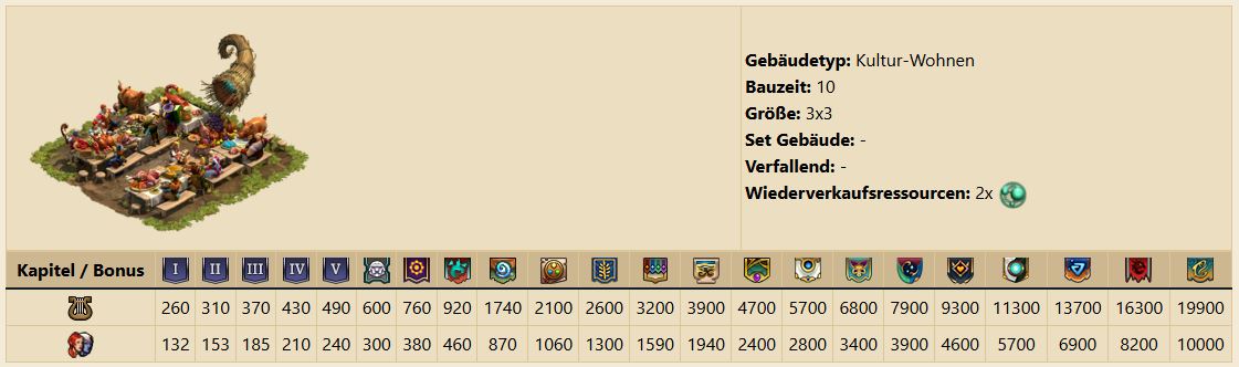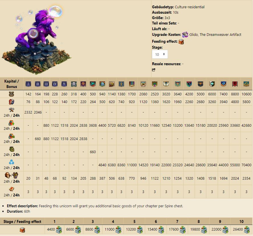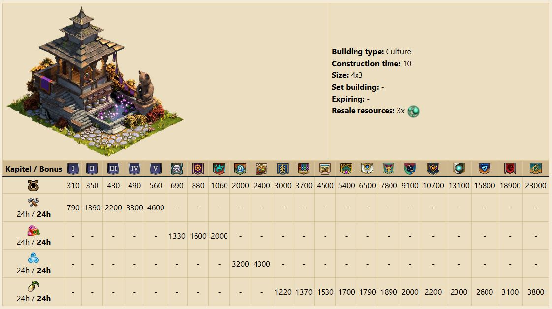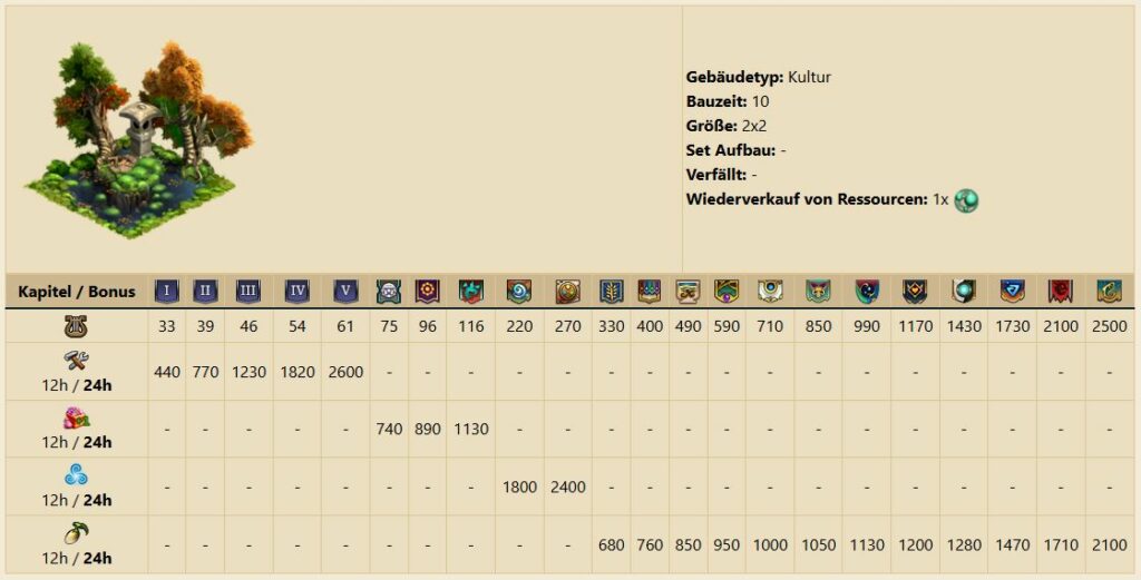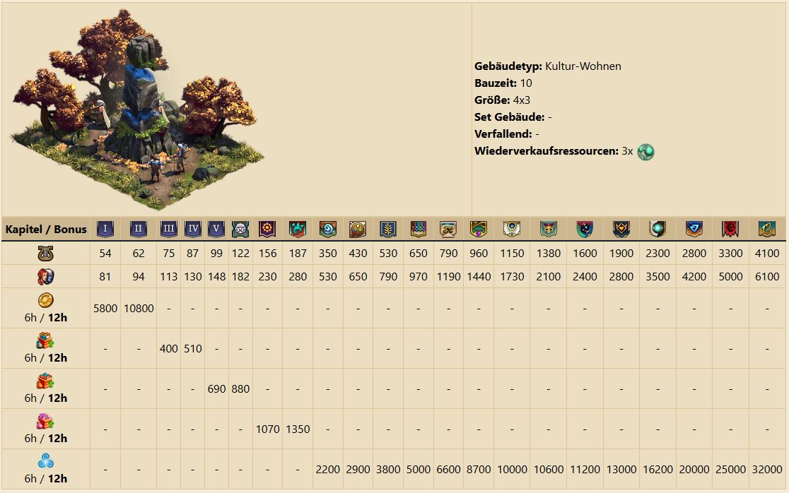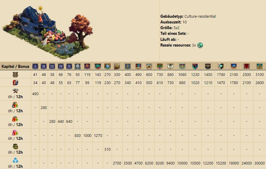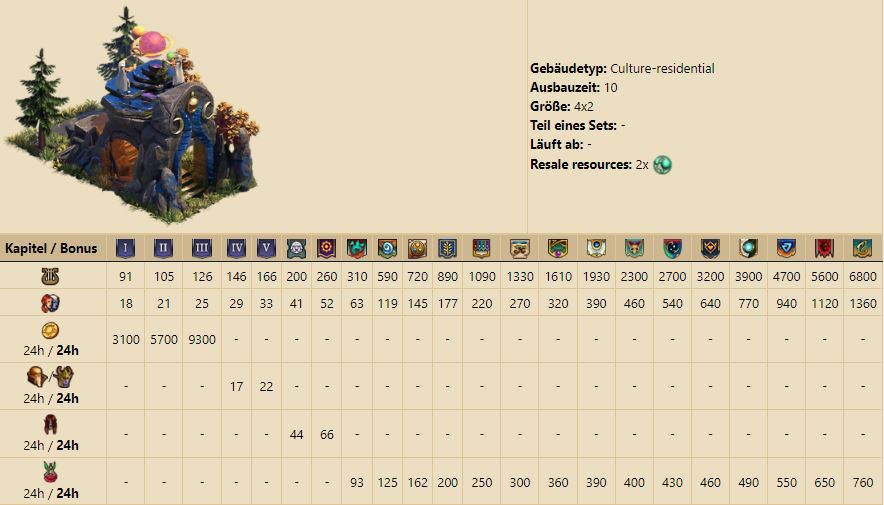Das Gebäude produziert Bevölkerung, Kultur, Bonus Basis-Standardgüter, Kasernenmagier, Mana und WP, abhängig von der Stufe des Gebäudes. Das Gebäude ist auch ein Haustier und der Fütterungseffekt gibt die letzten Bonus-Standardgüter deines Kapitels pro Truhe und hält 60 Stunden an.