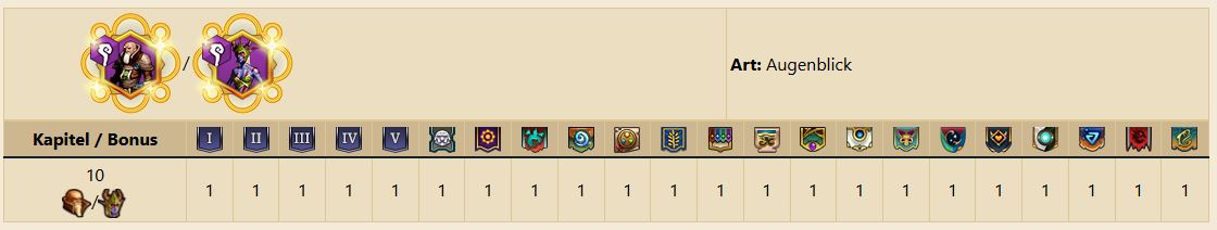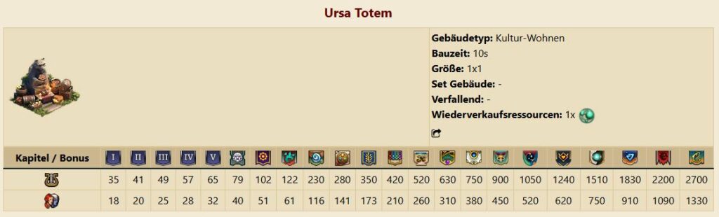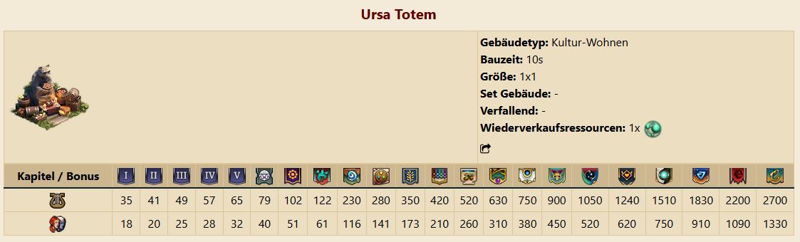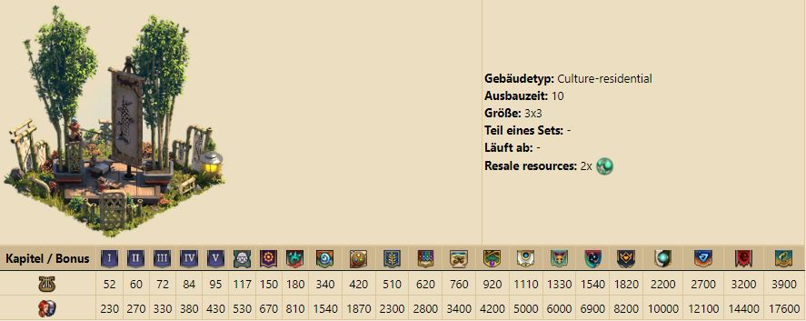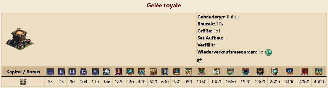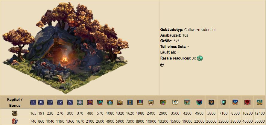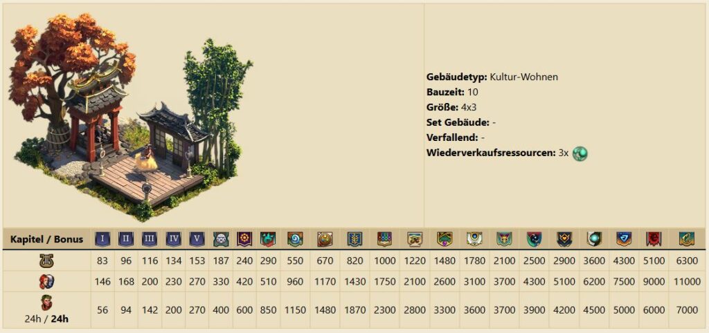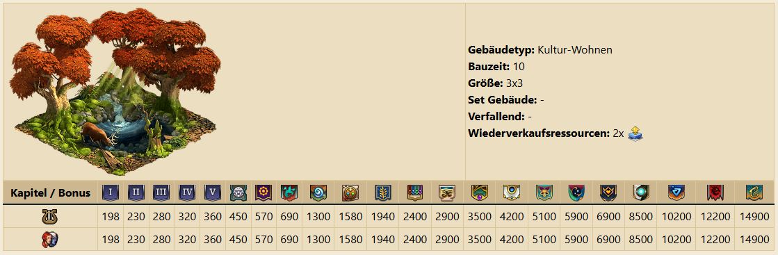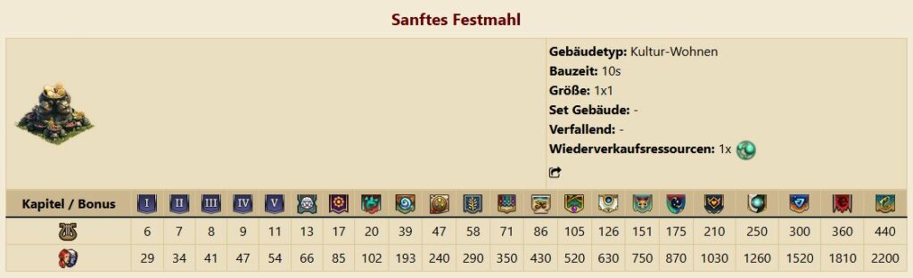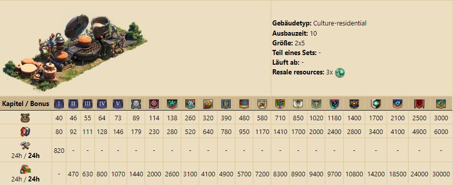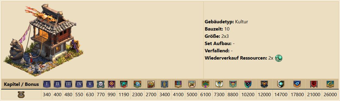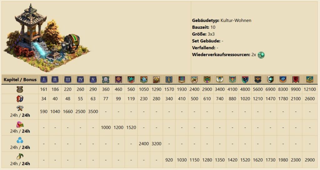 Das Gebäude produziert Bevölkerung, Kultur, Bonus Basis-Standardgüter, Kasernenmagier, Mana und WP, abhängig von der Stufe des Gebäudes. Das Gebäude ist auch ein Haustier und der Fütterungseffekt gibt die letzten Bonus-Standardgüter deines Kapitels pro Truhe und hält 60 Stunden an.