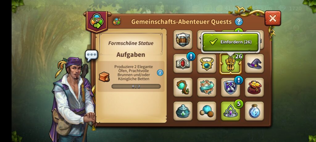Wenn ihr mehrere Abzeichen von einem Typ dieser 5 „schweren“ Abzeichen (Bauern, Schmiedegilden, Halsketten, Statuen, Münzsäcke) erstellt habt, seht ihr das in eurer GA Übersicht. Klickt in der Event- und Questleiste auf das Gemeinschaftsabentuer (drei färbige Kreise). Deine neu erstellten Abzeichen werden dort ersichtlich sein. Anzahl merken, auf „Einfordern“ klicken und somit die Anzahl für die neu hinzugekommenen Abzeichen dieses Typs auf 0 setzen.