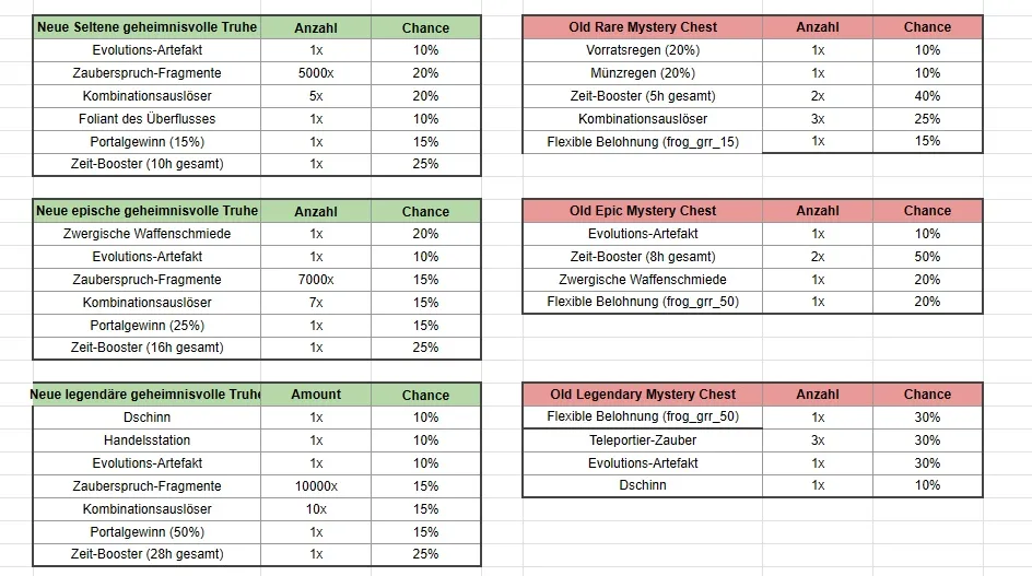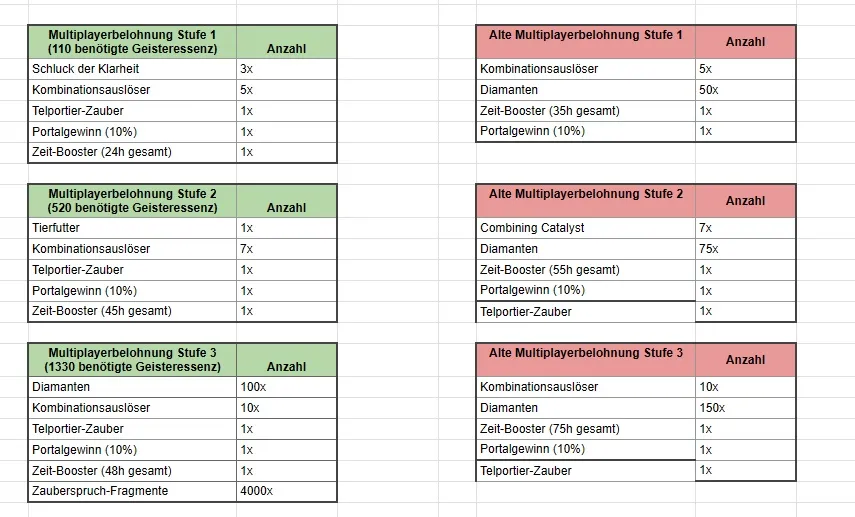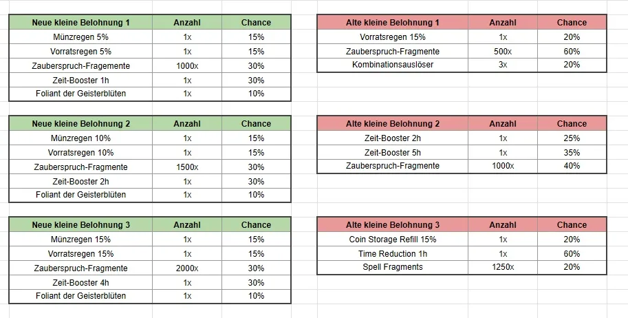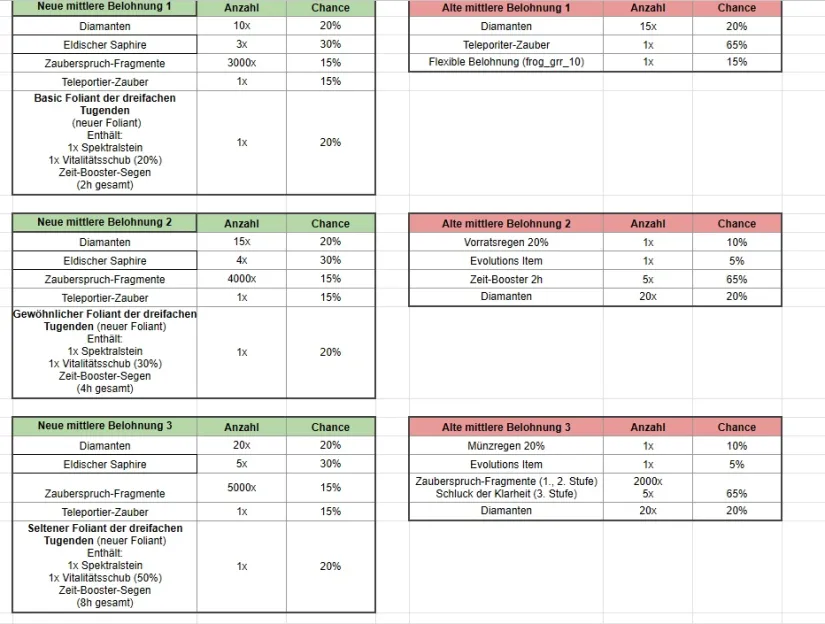 - und wir erhöhen die Anzahl der Zeit-Booster, die für unsere kleinen (Klein 1, Klein 2, Klein 3) und mittleren (Mittel 1, Mittel 2, Mittel 3) Belohnungen verfügbar sind. Für die mittleren Belohnungen werden wir die Zeit-Booster als auswählbare Belohnung in den Folianten beibehalten.