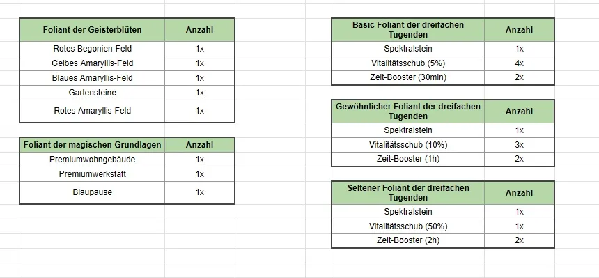 - und 3 neue Folianten der dreifachen Tugenden hinzugefügt, die Spektralsteine, Vitalitätsschübe und Zeit-Booster enthalten – je weiter ihr fortschreitet, desto besser wird der Foliant, den ihr bekommt.