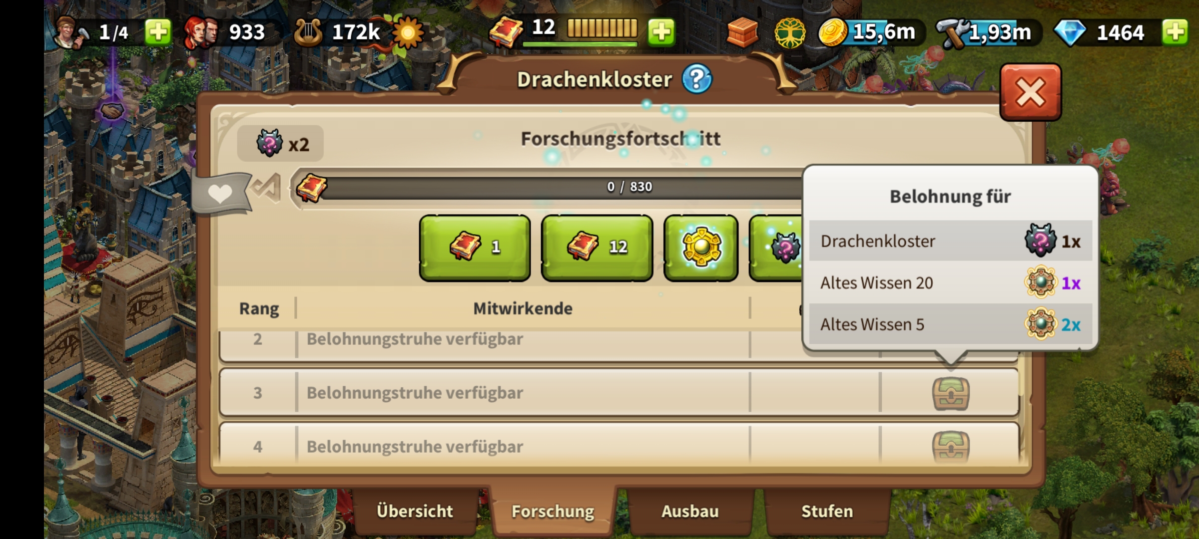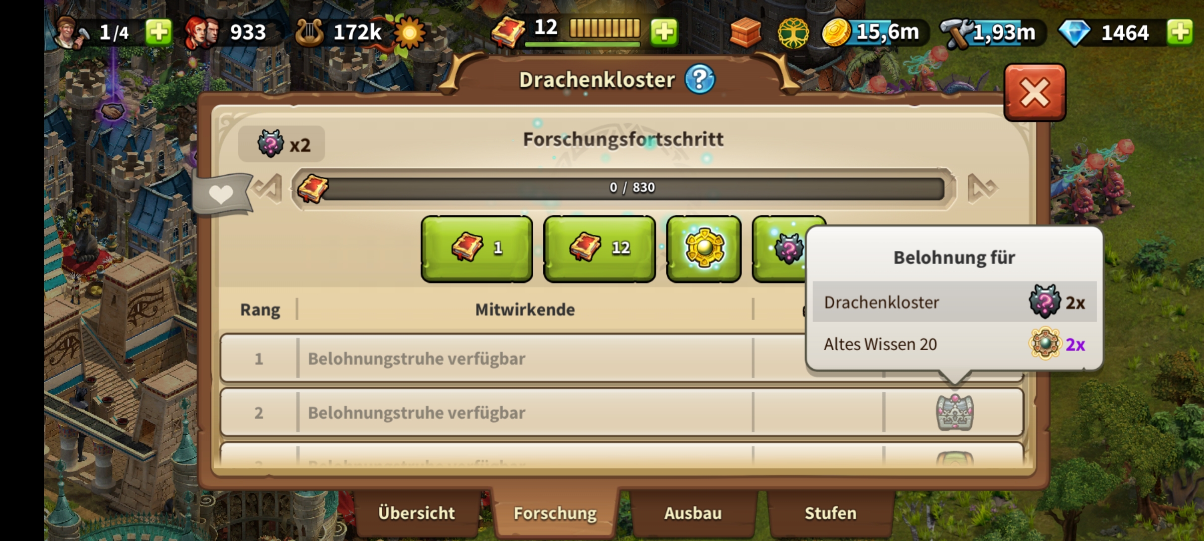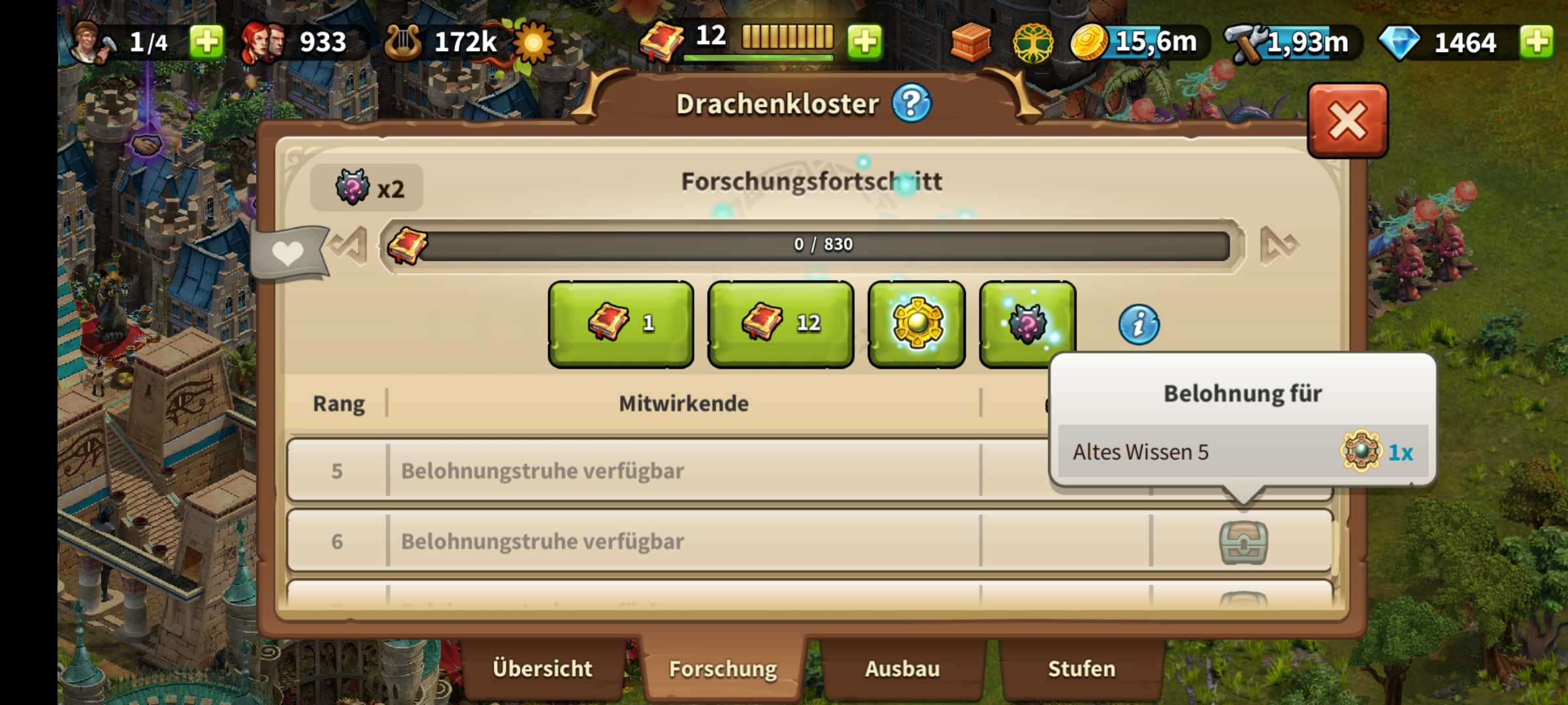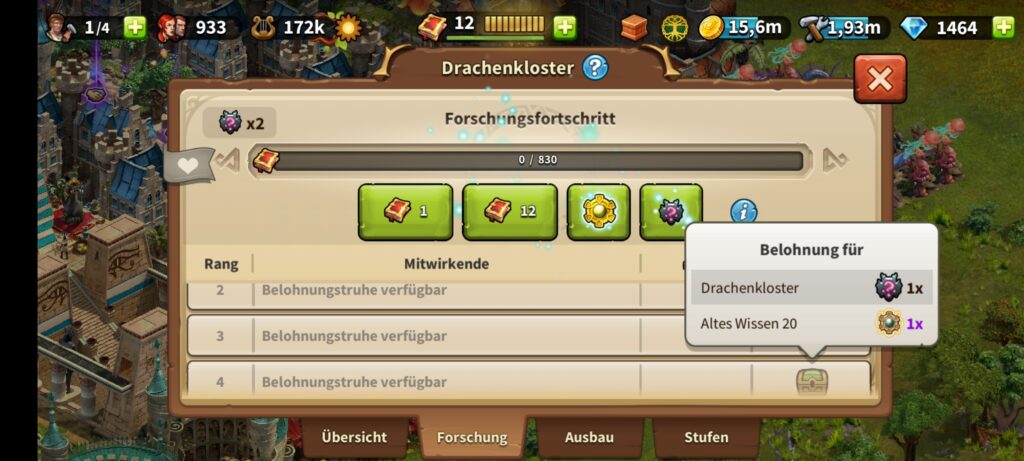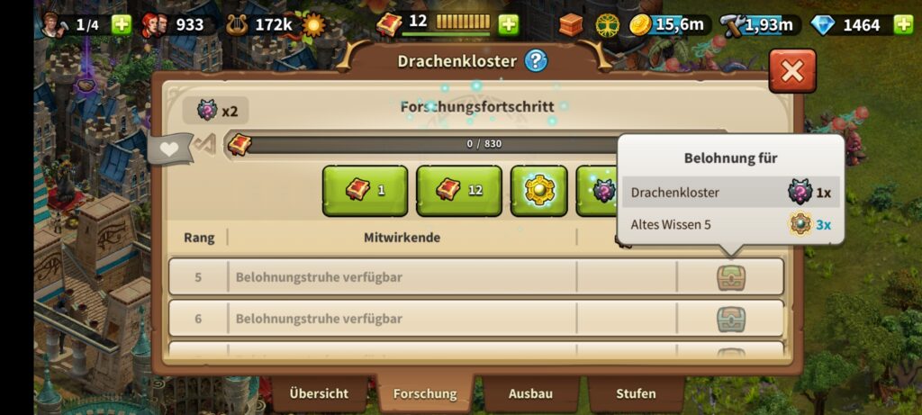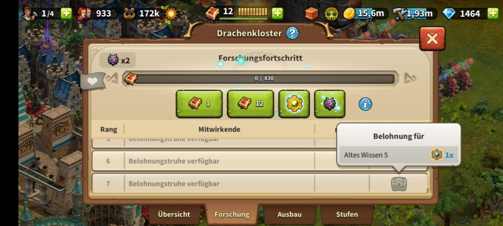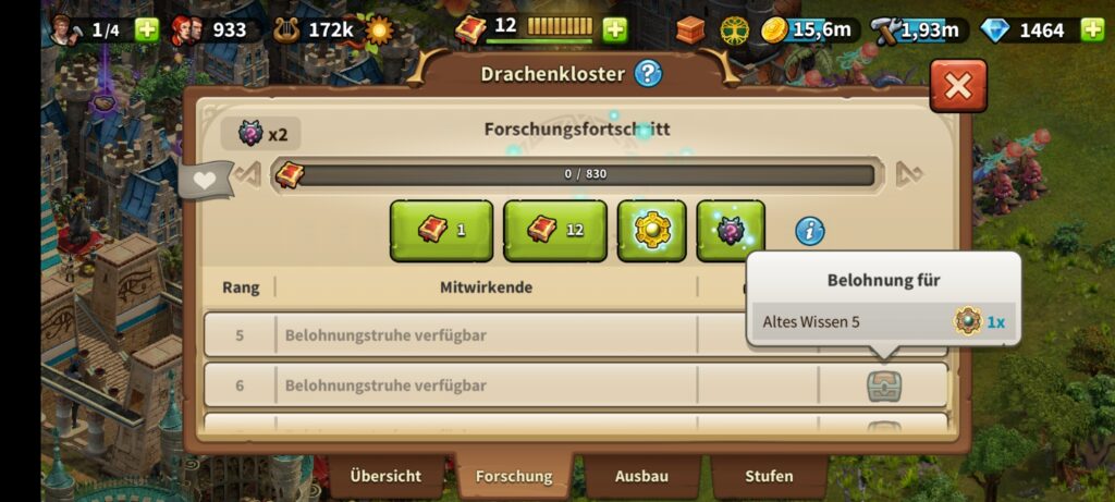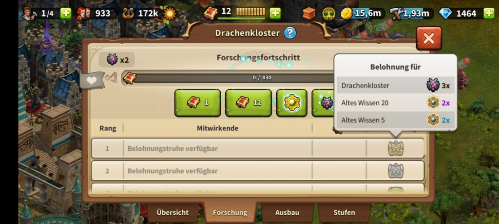 Jede Belohnungstruhe hat ihren eigenen Wert. Wenn man mit dem Mauszeiger darauf geht, wird der Inhalt angezeigt. 1 Rune = 15 WP