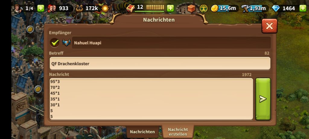 Am Smartphone kann man Wunder von den Spielern der anderen Gilde nur füllen, in dem man in der PN auf den Namen des jeweiligen Spielers klickt. Dann auf „Antike Wunder Hilfe“.