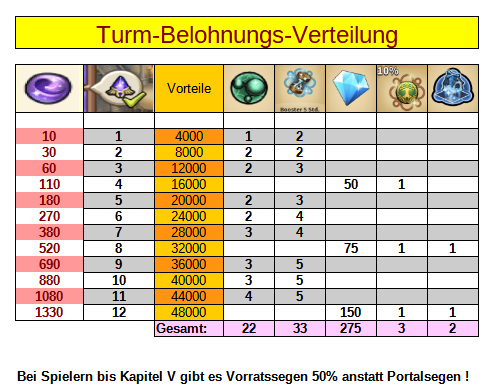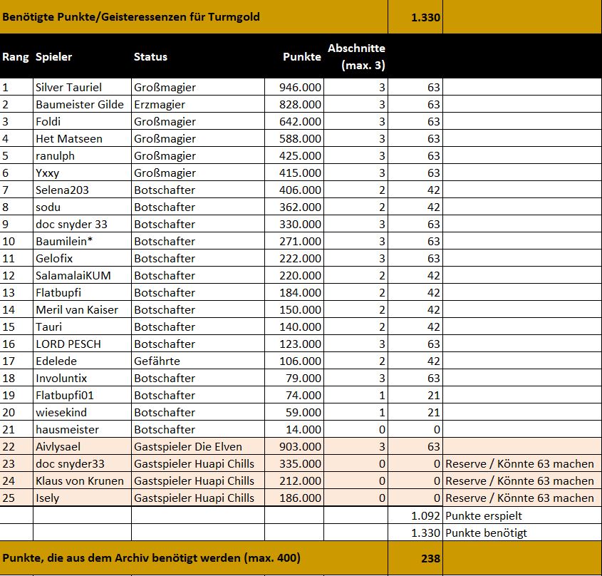 Die Anforderungen an den Goldturm sind nicht ohne. Um ganz sicher genügend Punkte zu erreichen, findet ihr anbei eine Liste, auf der ihr sehen könnt, wie viele Abschnitte ihr bitte MINDESTENS geht. Die Einschätzung basiert auf euren letzten individuellen Turm-Ergebnissen. Wer Güter braucht, soll sich bitte melden, die Magier spenden gerne!
